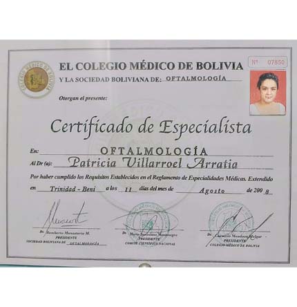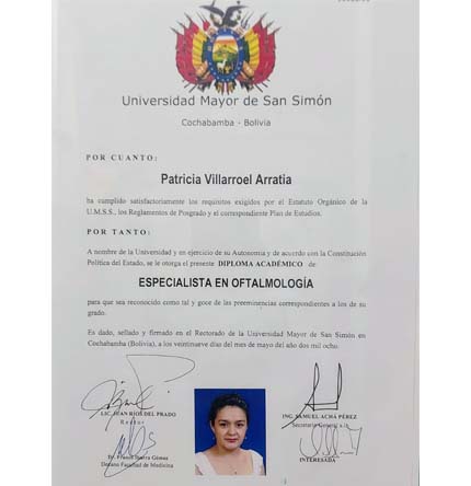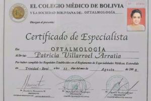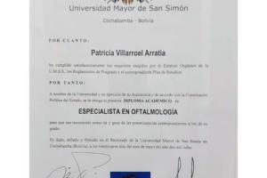 La Dra. Patricia Villarroel realizó sus estudios de Oftalmología, en la Universidad Mayor de San Simón, Cochabamba, Bolivia.