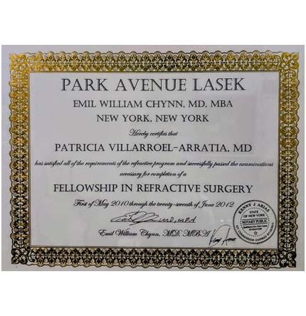 Fellow en Cirugía Refractiva, en el Fellowship Oftalmología, en Park Avenue Lasek Vision, en New York, EE.UU, junto al creador de la tecnica LASEK, Dr. Emil Chynn MD